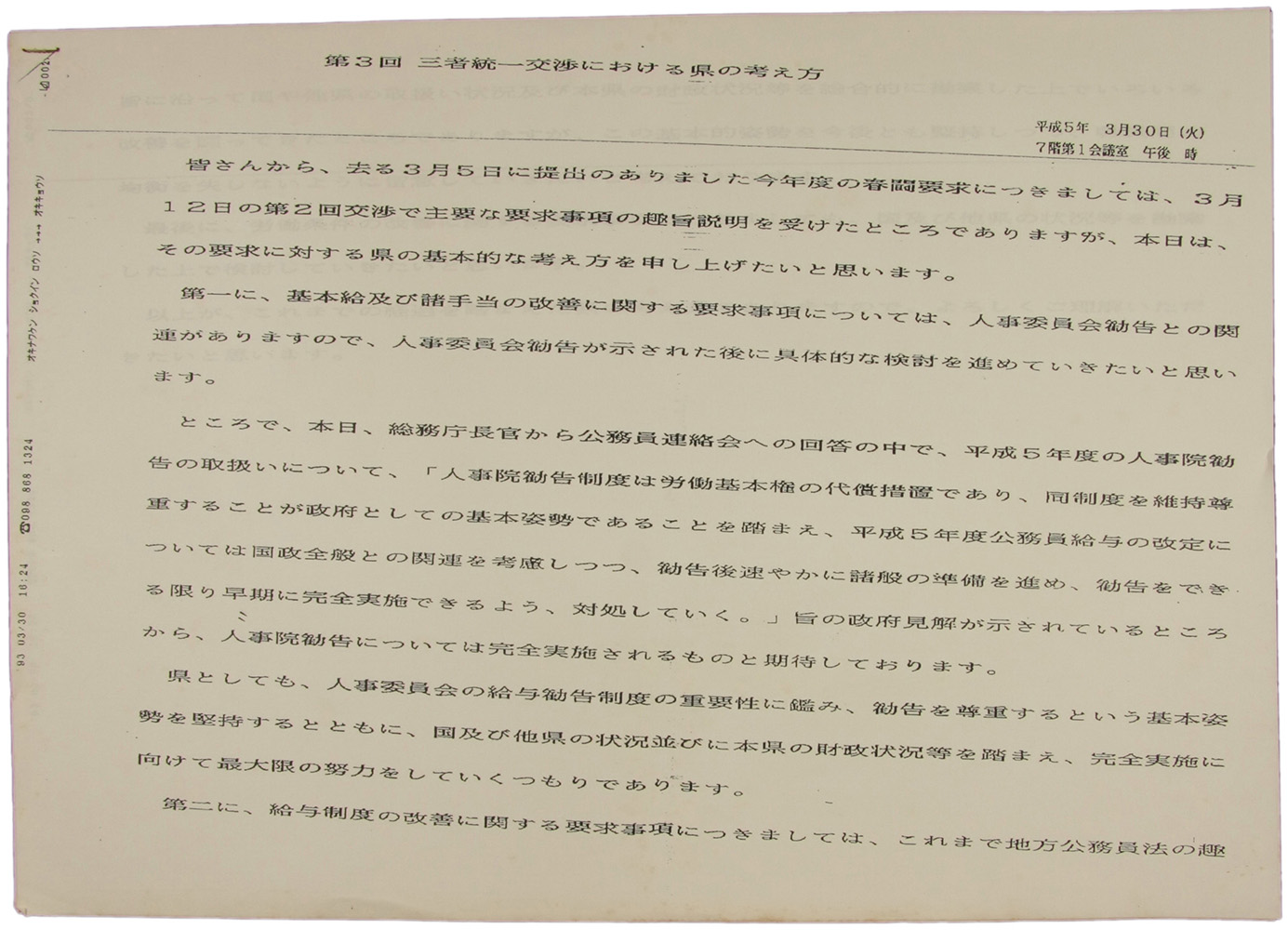 第3回 三者統一交渉における県の考え方 平成5年3月30日