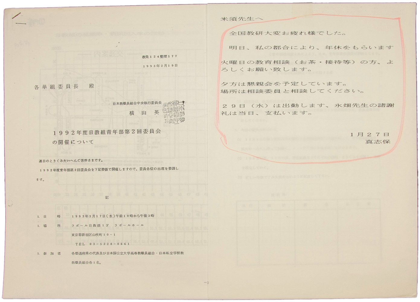 > 1992年度 日教組青年部第2回委員会の開催について