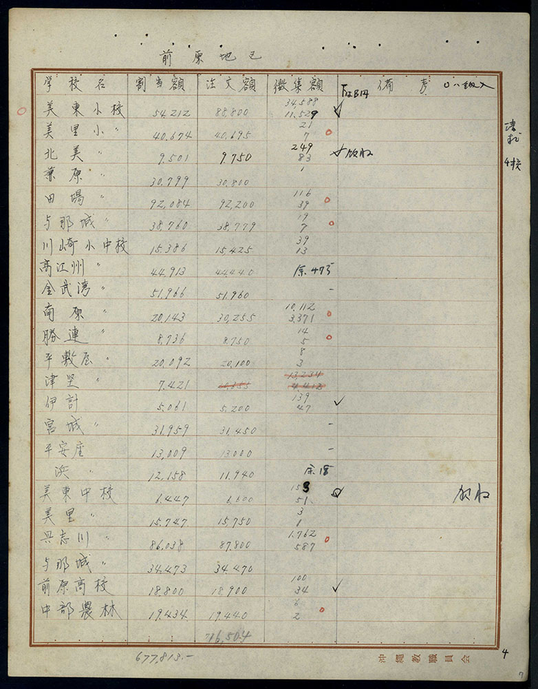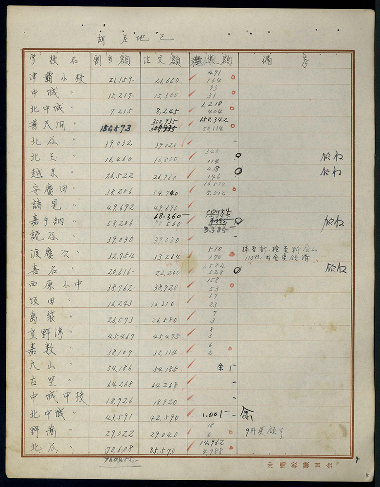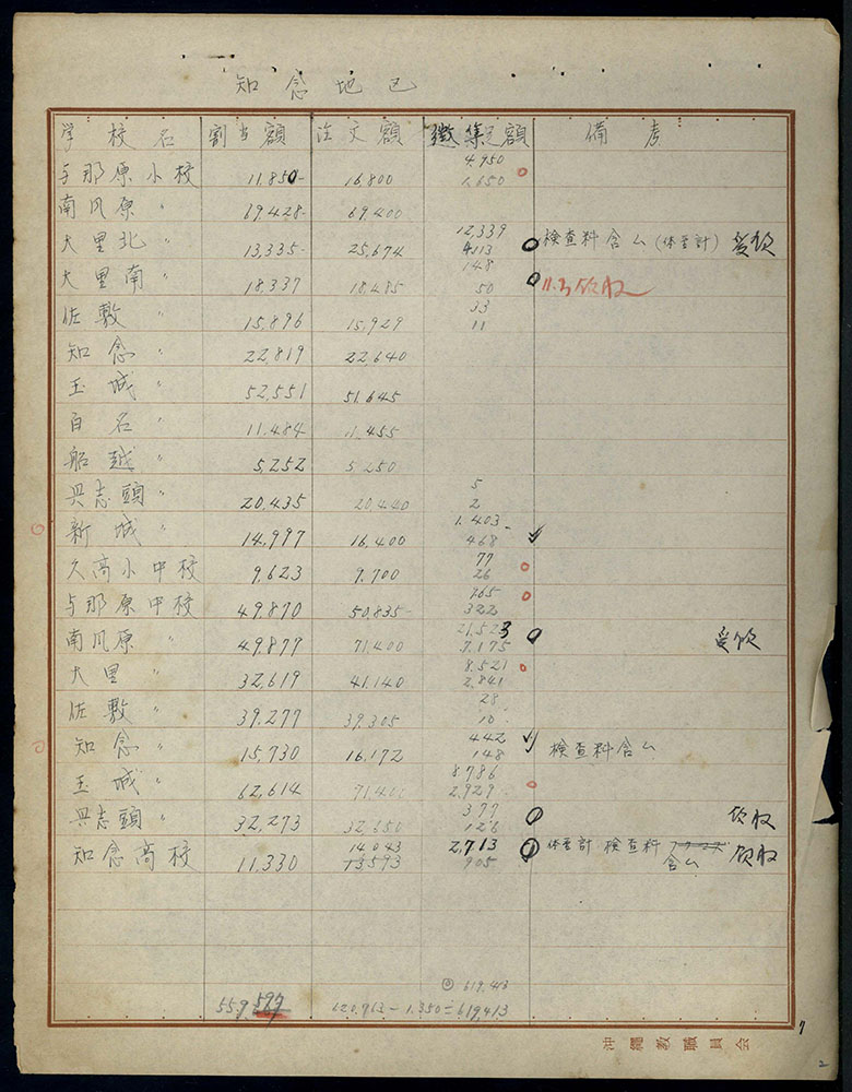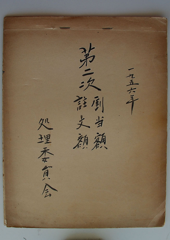 【表装】表紙は白紙に墨字で「一九五六年 第二次割当額註文額 処理委員会」ある。上ホチキス綴じ。【法量】縦横:27×21cm、総頁数18枚【内容】第2次割当額注文額が、学校名、徴集額と共に以下各地区毎に記載。 糸満地区、知念地区、那覇地区、胡屋地区、前原地区、石川地区、宜野座地区、名護地区、辺土名地区、久米島地区、宮古地区、八重山地区