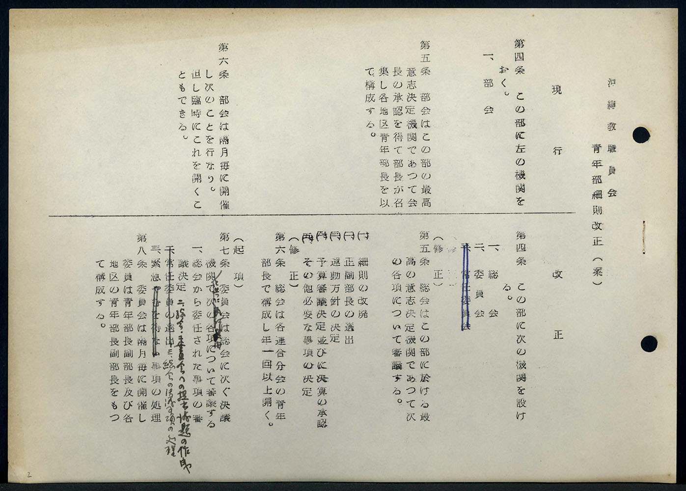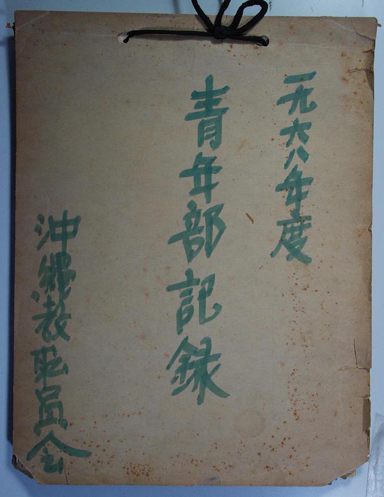 【表装】表紙は白紙に青ペン字で「一九六八年度 青年部記録 沖縄教職員会」とある。上紐綴じ。【法量】縦横:28×21cm、総頁数59【内容】1968年度 青年部関係書類綴じ ○部会 3月11日 午後5時 地区からの要望提案 ○沖縄教職員会青年部細則改正(案) ○第2号議案 1969年度事業計画(案) ○第10号議案 斗争資金の拠出について ○部会開催通知 1969年3月11日 議題1、1969年度運動方針について 2、1969年春斗方針について 3、総会に向けての諸問題について 4、その他 ○青年部長の出張許可依頼 1969年1月13日 協議題1、B52撤去ゼネストについて 2、今度の活動について 3、その他 ○青年部本土派遣 など