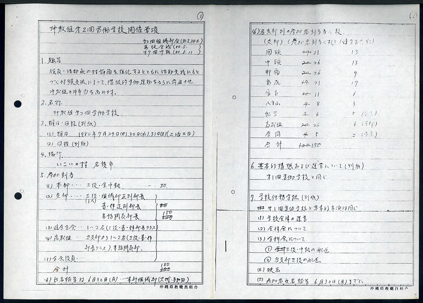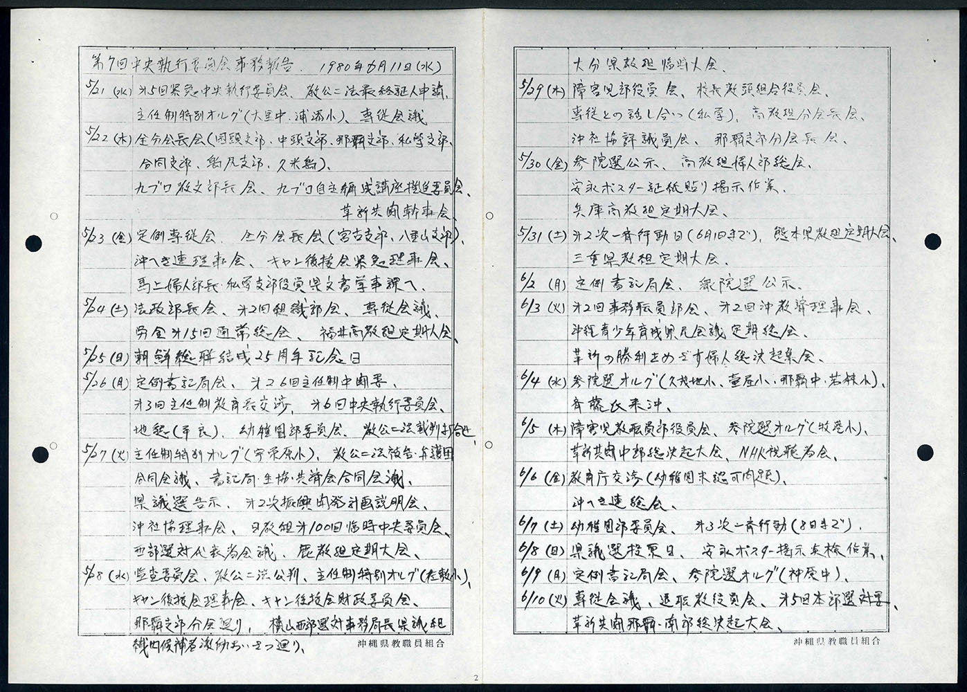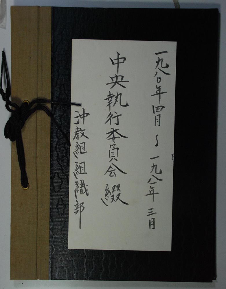 【表装】表紙は黒表紙に筆ペン字で「一九八〇年四月~一九八一年三月 中央執行委員会綴 沖教組組織部」とある。左紐綴じ。【法量】縦横:×cm、総頁数【内容】