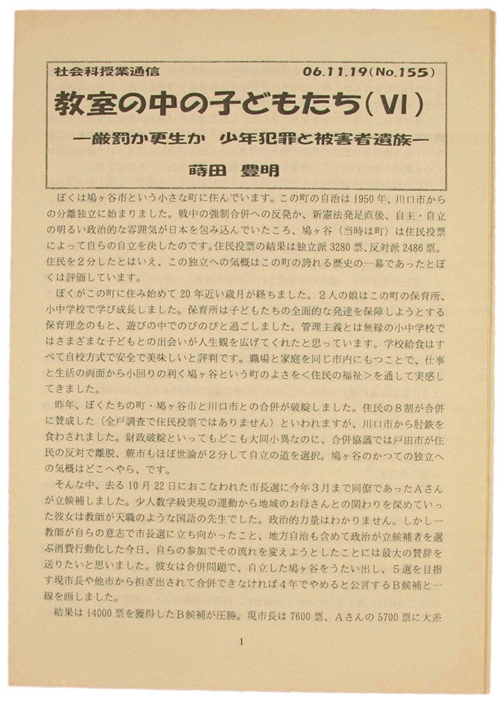 > 社会科授業通信№155 教室の中の子どもたち(Ⅵ) 他