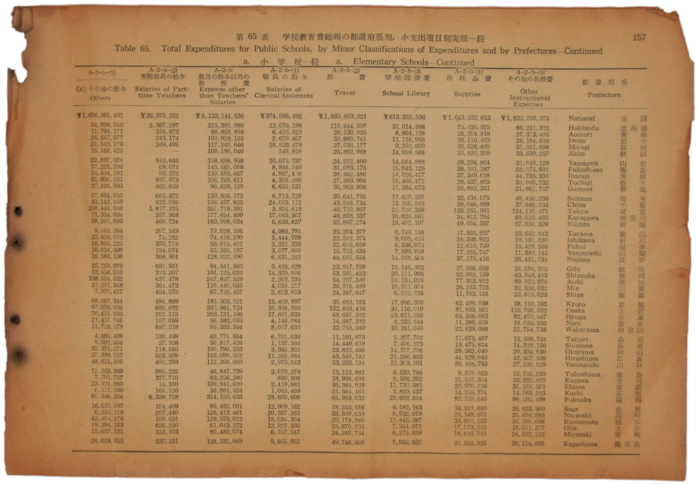 第65表 学校教育費総額の都道府県別、小支出項目別実額一続、