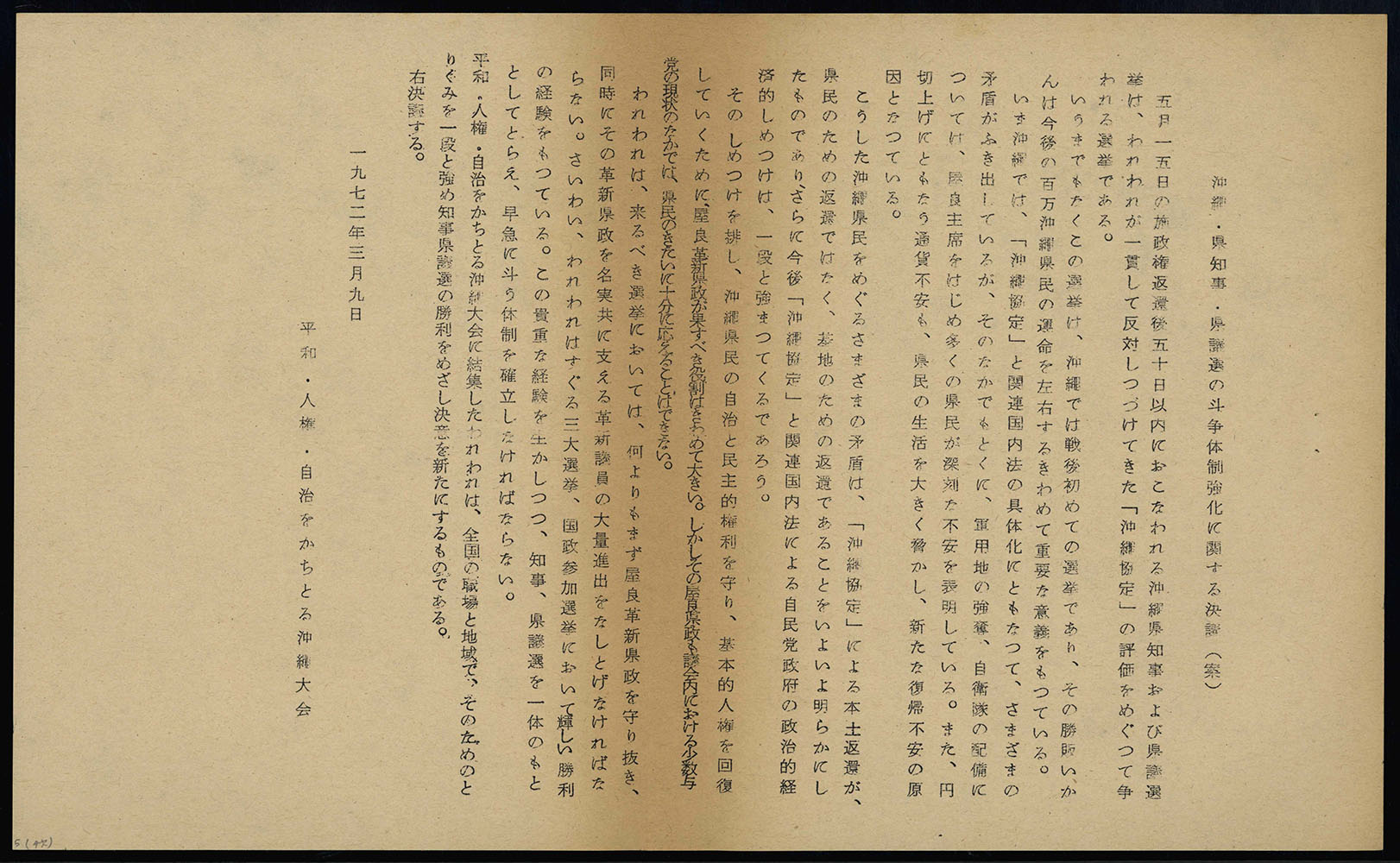 > 四次防と自衛隊の沖縄配備に反対し、基地撤去、安保廃棄を要求する決議