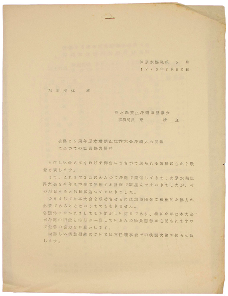 被爆25周年原水爆禁止世界大会沖縄大会開催に当たっての動員協力要請