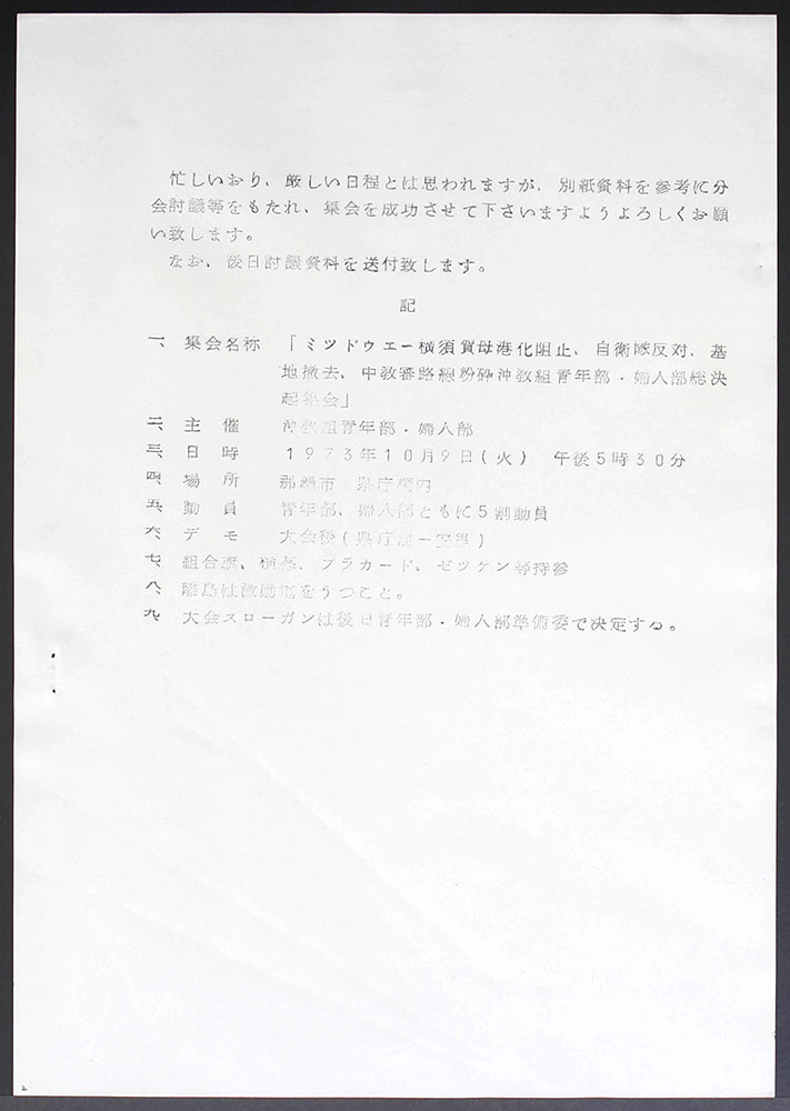 > 「ミッドウェー横須賀母港化阻止、自衛隊反対、基地撤去、中教審路線粉砕沖教組青年部、婦人部総決起集会」他