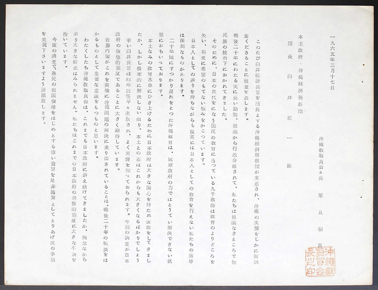 一九六五年三月十七日 沖縄経済視察団に対する請願書