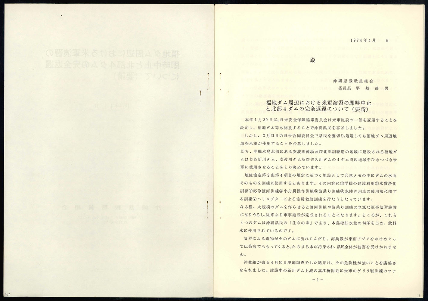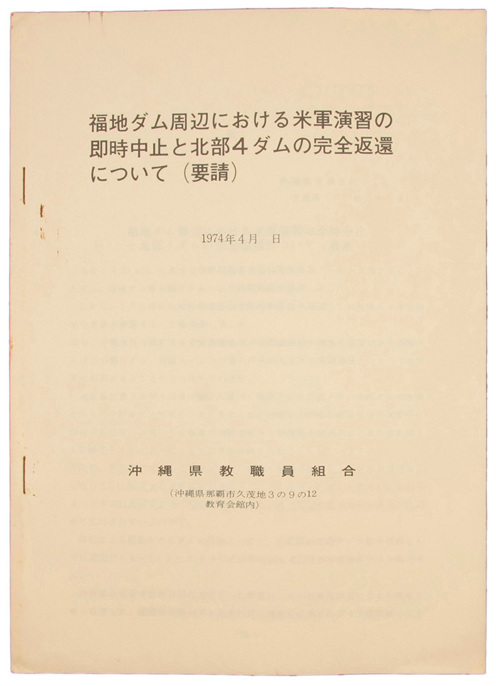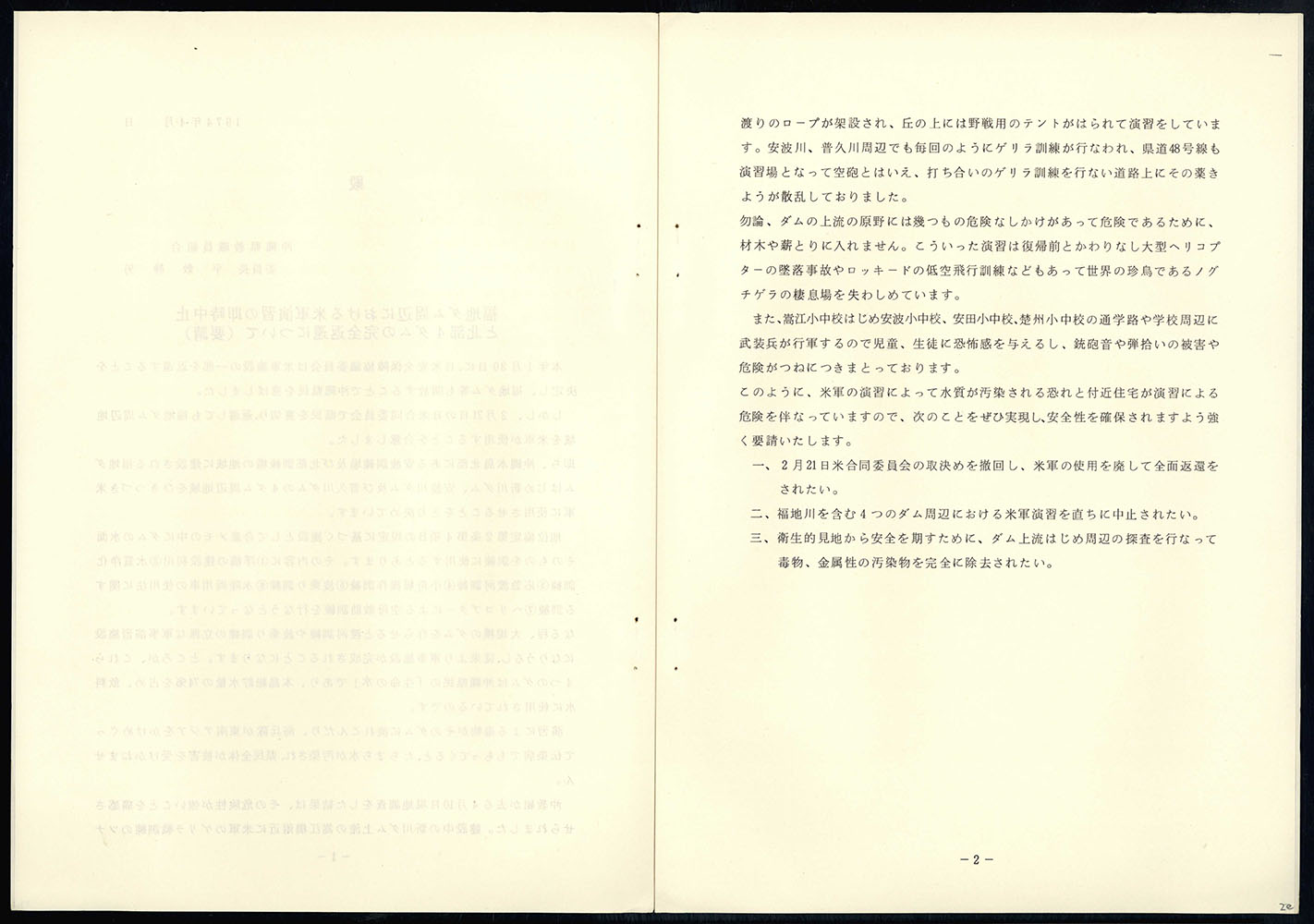 福地ダム周辺における米軍演習の即時中止と北部4ダムの完全変換について(要請) 1974年4月