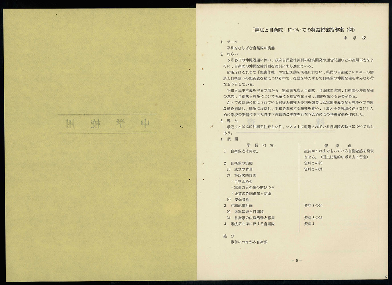 平和と民主主義を守るための自衛隊の沖縄配備に対する特設事業指導案(例)
