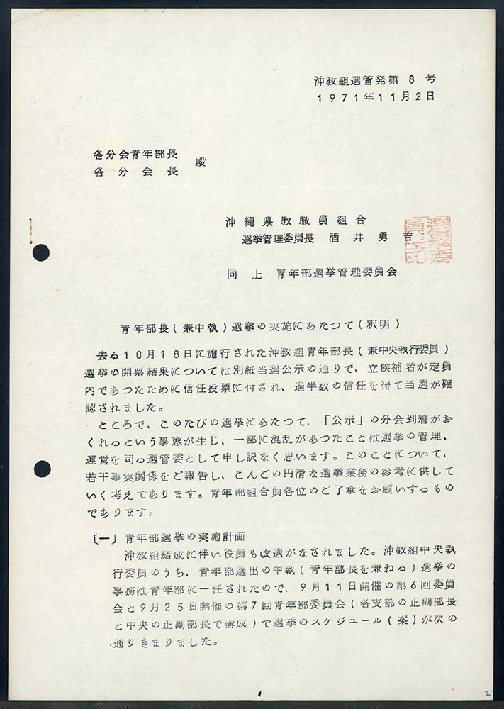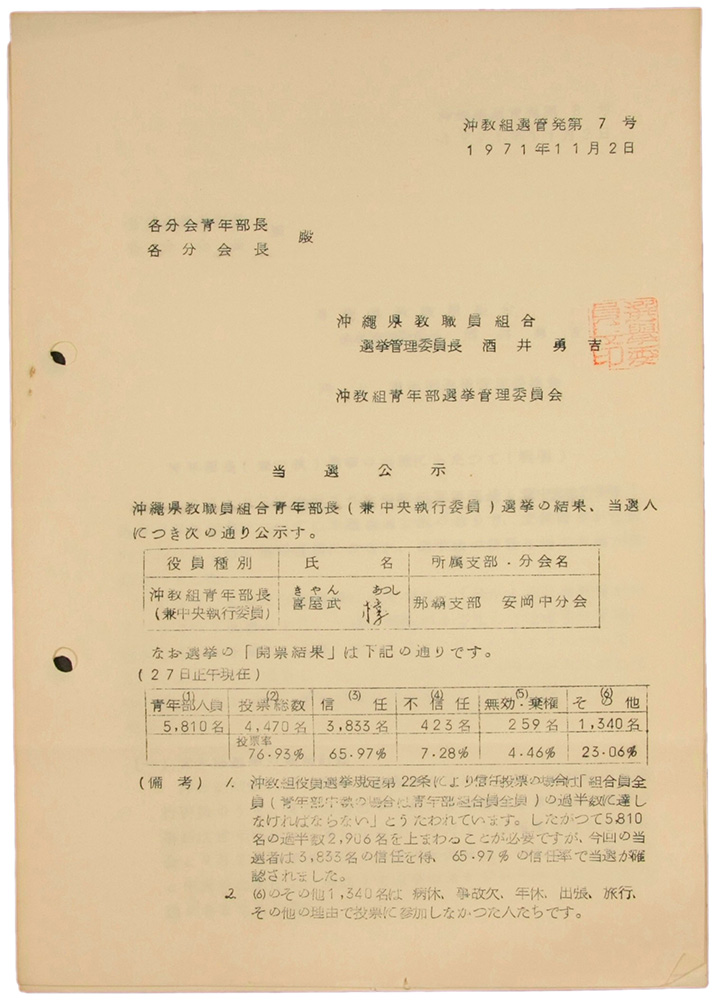 沖縄県教職員組合 選挙管理委員長 酒井勇吉